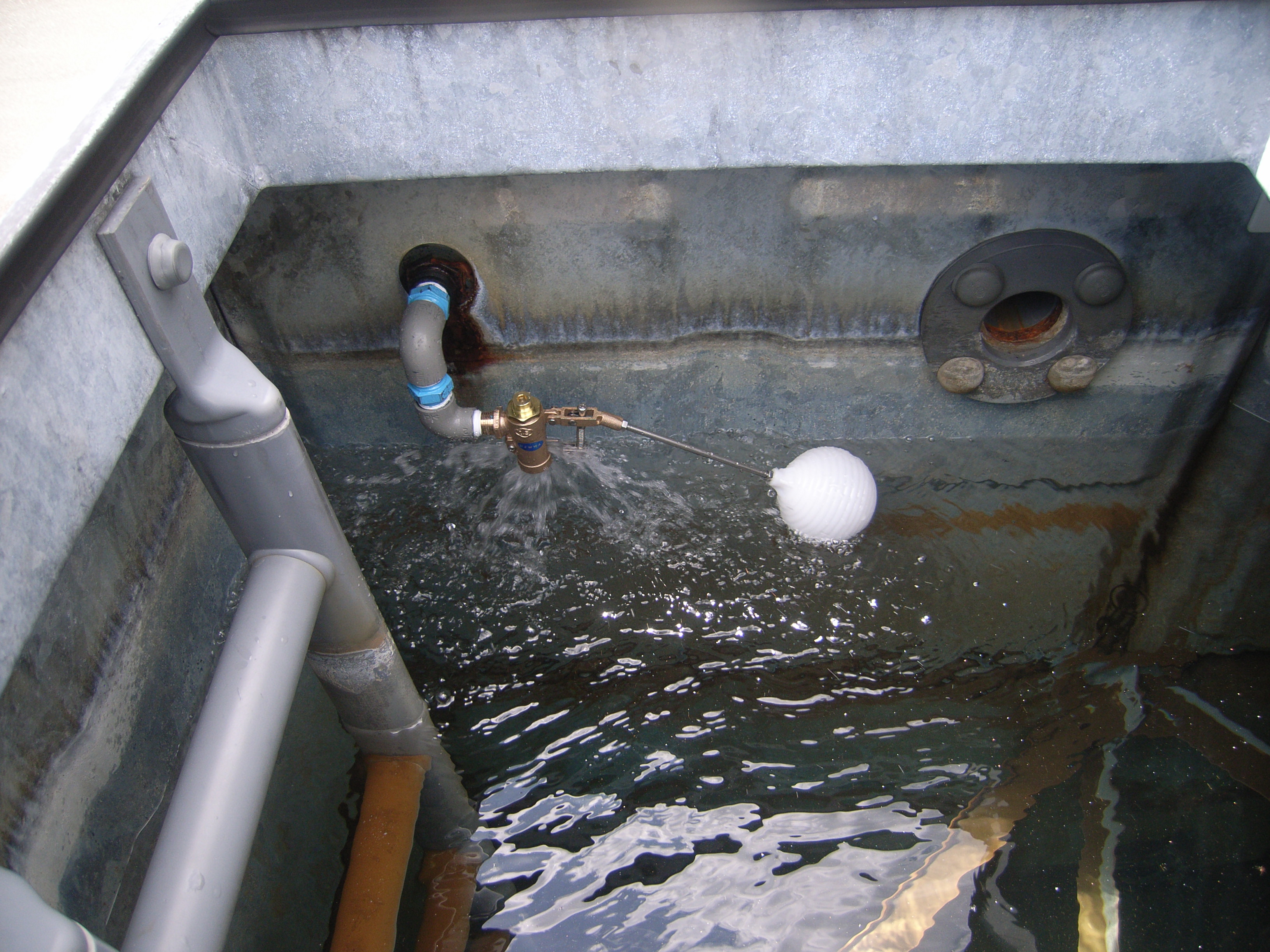 東大阪の某会社様にて受水槽の給水管補修工事を行いました。受水槽へ給水するパイプが劣化のため水漏れしており、直してほしいとのご依頼でした。漏水箇所のパイプを取り外し、止水栓も新しいものを取付しました。受水槽内部のボールタップも取替し、露出の配管を保温して完成です。これでまた何年かは安心してご使用いただけます。受水槽の設置、補修、及び清掃に関しても承っております。お困りごとがございましたらお気軽にお問い合わせください。