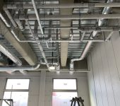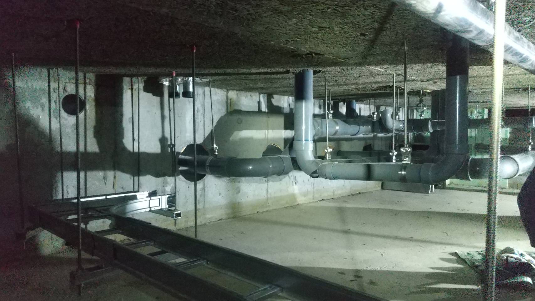 昨年から計画が進行していた5階建ての工場の建設が着々とすすんでいます。1F~4Fの水回りは全て天井配管、5階はほとんどが床下配管となっています。1フロアの階高が6m弱あるため、写真で見てもとても高く見えますね。お総菜を工場で大量に作るため、醤油とお酢も配管を通して供給されるとのことでとても面白いなと思いました!そちらの配管も弊社が担当させていただいております。また仕上がりの写真もアップしていきます♪
